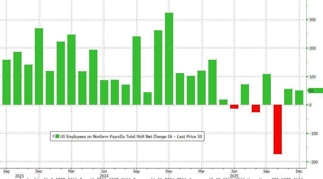 Ahead of today's jobs report, expectations were that the NFP number would show another rebound from the terrible Sept/Oct prints, but remain muted (or else spark fears about reheating and an end to the Fed's easing cycle). Well, that's precisely what we got moments ago when the BLS reported that in December the US gained 50K jobs, a modest miss to estimates of 50K, but smack in the middle of JPM's sweet spot range of 35K-75K (as previewed earlier) which would be best for the market.