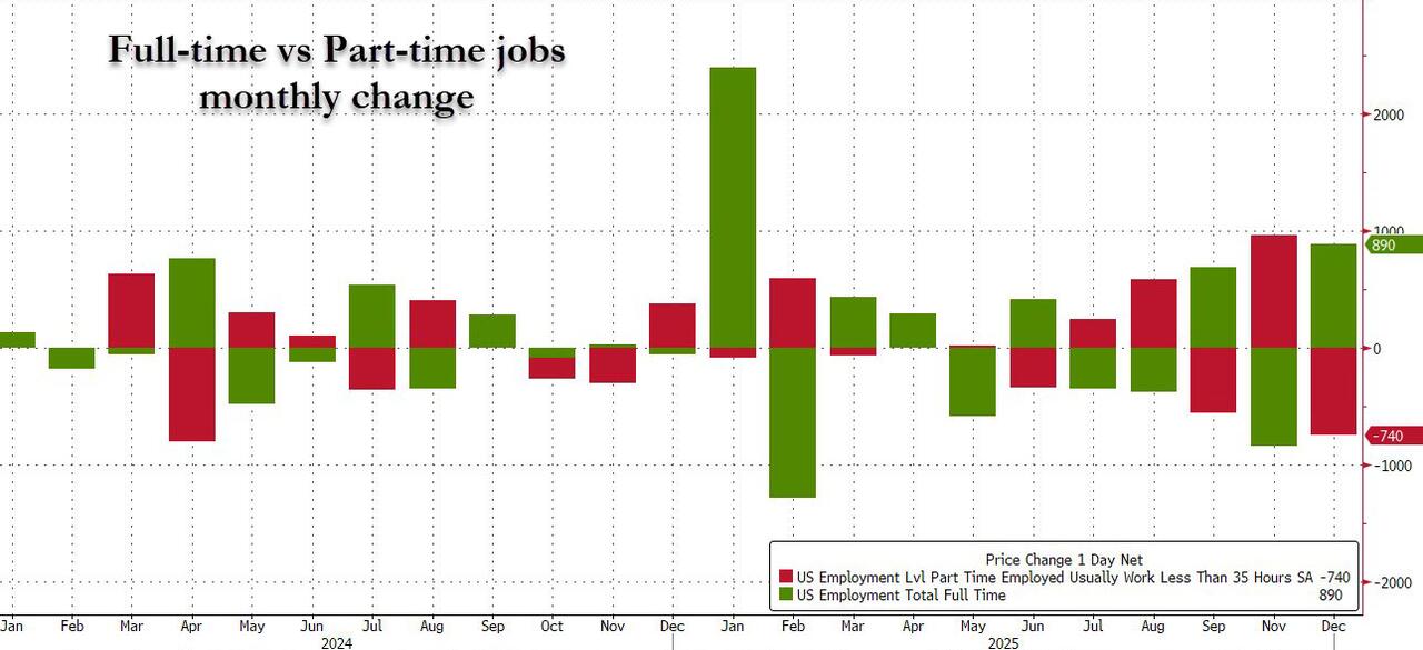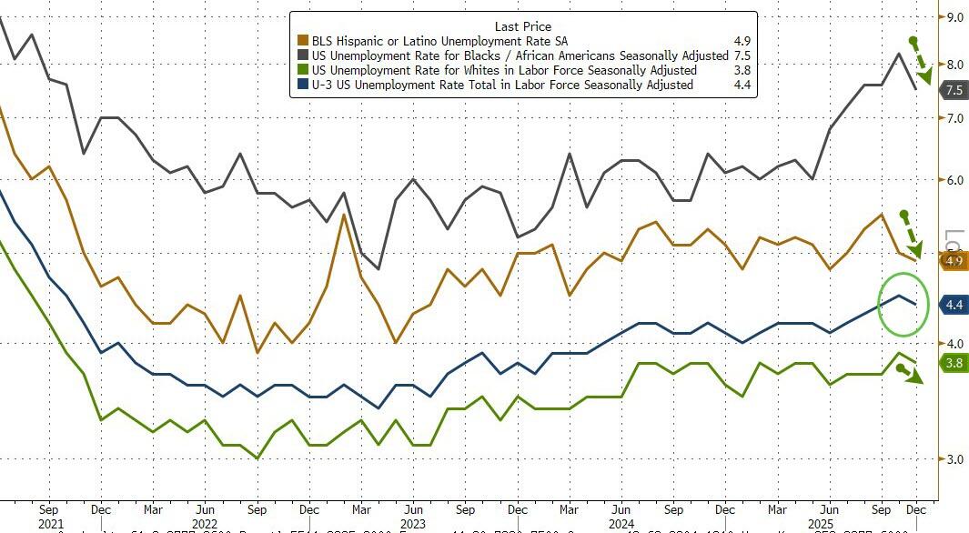 While there was NFP print was on the weak side, there was a modest improvement in the unemployment rate, which dipped from a downward revised 4.5% (was 4.6% originally) to 4.4%, which still is the highest since 2021, save for Nov 2025. Among the major worker groups, the unemployment rates for adult men was 3.9%, adult women 3.9%, teenagers 15.7%, Whites 3.8%, Blacks 7.5%, Asians 3.6%, and Hispanics 4.9%.