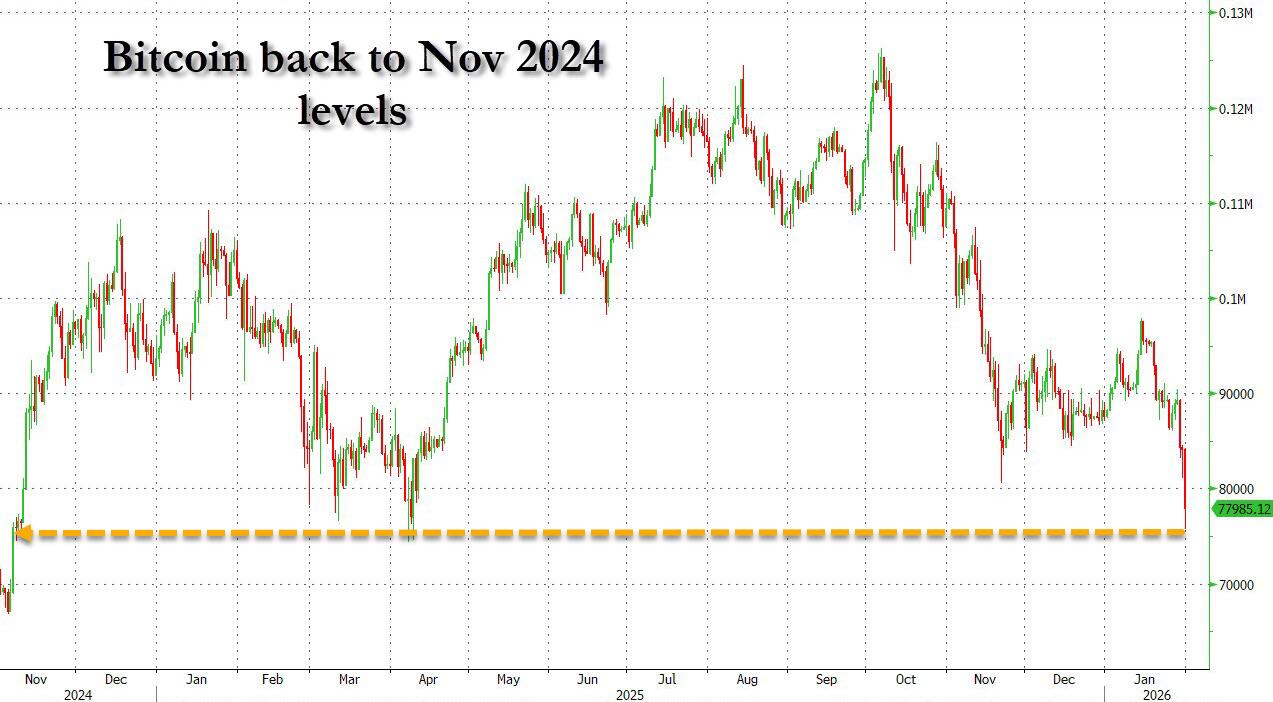The selling has pushed Bitcoin as low as $74,000 (it was almost at $100K last week), and is at the lowest price since Trump became president (the April 2025 liberation day low of $74k was just taken out).