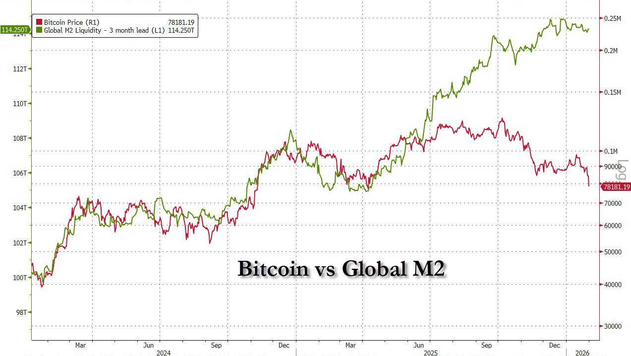 The latest crash in a long series, adds to weeks of disappointment for Bitcoin, which has failed to respond to a series of market developments that previously would have supported the asset. The dollar weakened for much of January, but the move did little to lift sentiment in crypto markets; if anything bitcoin slumped alongside the dollar. Likewise, Bitcoin offered no meaningful response during gold’s rally to record highs, nor has it attracted inflows in the wake of gold and silver’s sharp reversal on Friday.